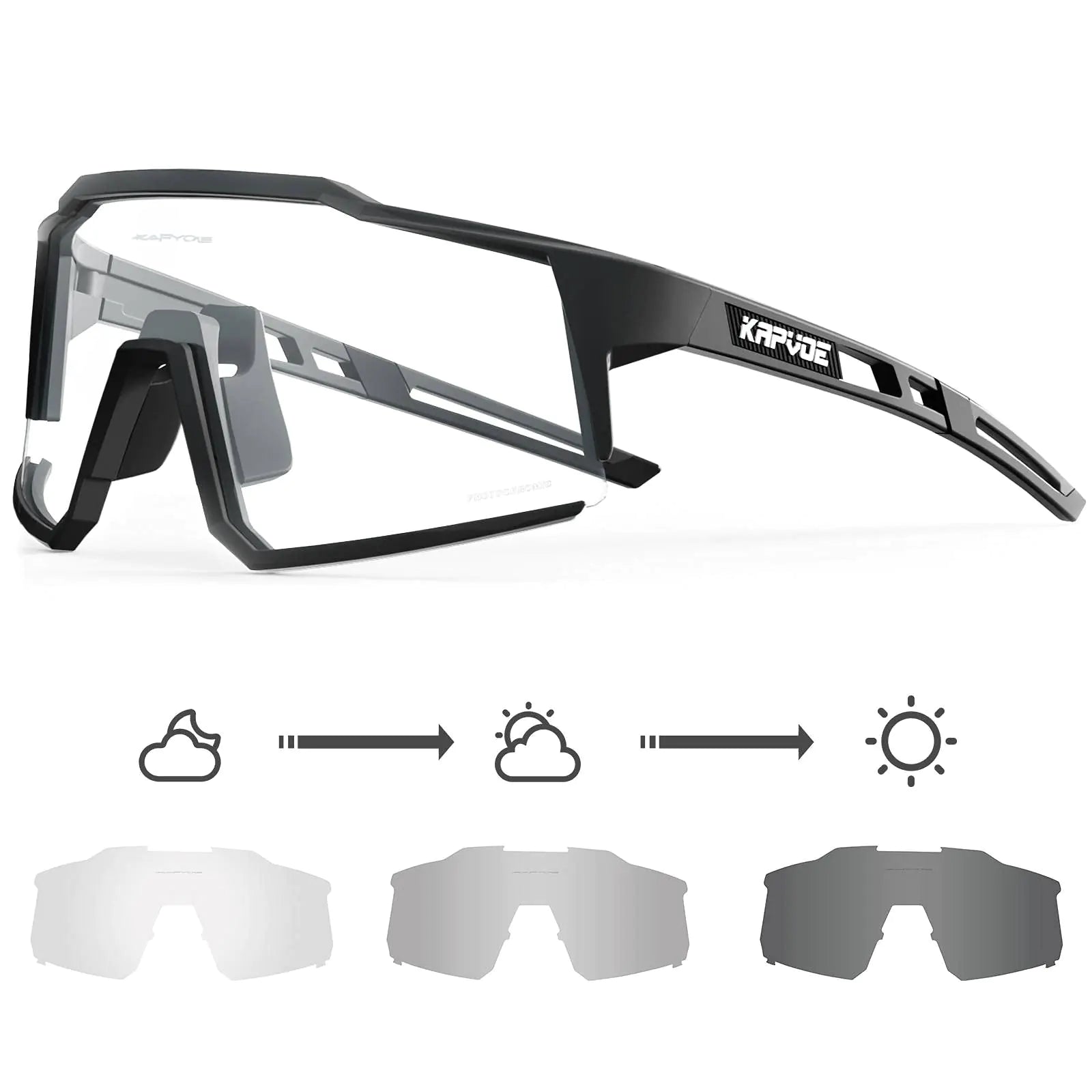 [【Photochromic Glasses】 Lenses will change from clear to dark gray in response to the intensity of the ultraviolet and the visual light transmission of the photochromic lens is from 85% to 15%. Effectively maintain a suitable brightness to protect your eyes in strong sunshine. Attention!!! The darkness of lens color depends on UV intensity! 【Interchangeable Nose Pad】For different heights of nose bridges we have prepared 2 different sizes of soft nose pads in the mtb glasses package. You can choose one suitable to install. 【UV400 Protection】These clear bicycle glasses are made of high-grade photochromic lenses and ultra-light memory TR90 frames. Transition glasses lenses have UV400 protection can block harmful UVA & UVB rays safe durable and impact-resistant. 【Built-in Myopia Frame】Include a myopia frame in the cycling sunglasses package Convenient for you to configure prescription glasses. KAPVOE photochromic mountain bike glasses’ temples are flexible and have soft rubber nose clips suitable for different face shapes. 【Multifunctional Occasions】These sports glasses are perfect for cycling MTB BMX riding motorcycle driving skiing baseball mountain climbing fishing playing golf hiking boating and other activities.]